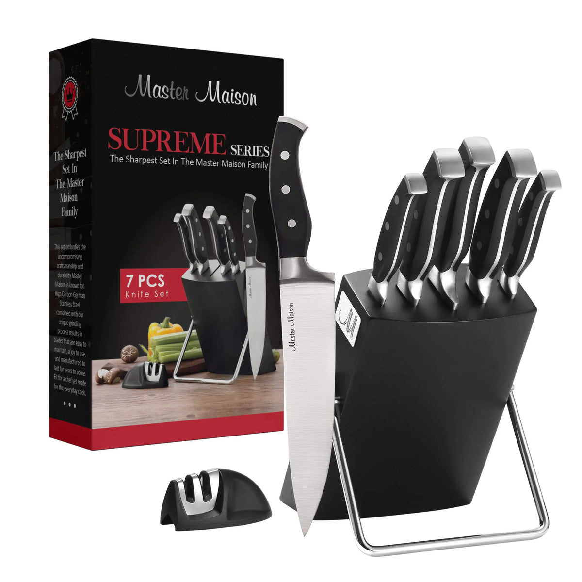 Everything you need, all in one elegant set. This 7-piece knife collection includes an 8" chef’s knife, 8" carving knife, 8" serrated bread knife, 5" utility knife, 3.5" paring knife, a knife sharpener, and a modern black storage block—your ultimate kitchen companion from prep to plating.