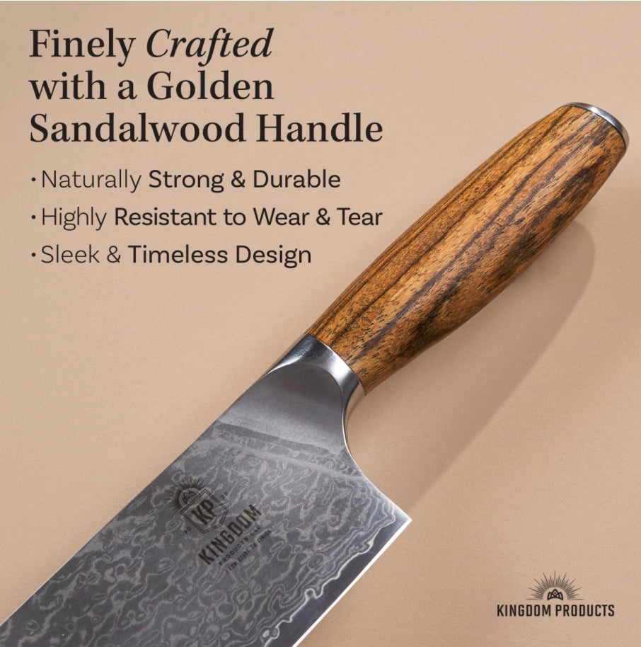 Redefine efficiency in the kitchen with the Kingdom Products Japan-Style Nakiri Knife. Expertly forged with a razor-thin 7-inch VG10 Damascus steel blade featuring an impressive 67 layers, each chop and slice delivers clean, consistent precision. The wide, flat-edged design makes quick work of vegetables, fruits, herbs, meats, and more — the true multitasker of the kitchen.
