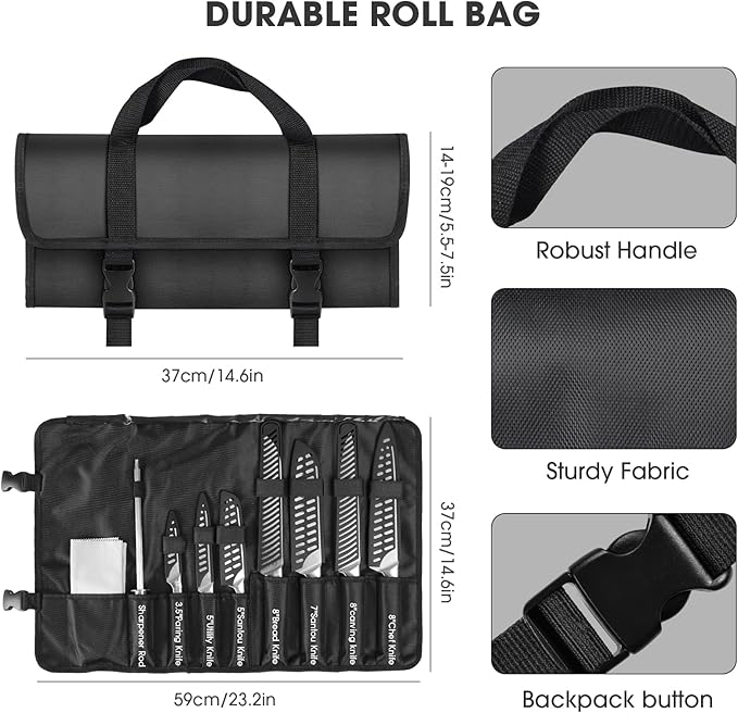 Includes: 8” Chef Knife, 7” Santoku Knife, 5” Santoku Knife, 8” Bread Knife, 8” Carving Knife, 5” Utility Knife, 3.5” Paring Knife, 8” Stainless Steel Sharpening Rod, 3 Finger Guards, 6 Knife Sheaths, and a Large Cleaning Wipe, all housed in a durable Oxford cloth travel bag for organized, safe storage.