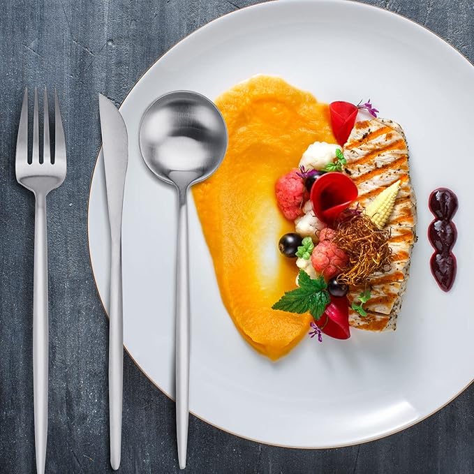 The Vanys Silverware Cutlery Set includes everything you need for a table of four—4 dinner knives, 4 dinner forks, 4 salad forks, 4 dinner spoons, and 4 teaspoons. Perfect for both daily dining and elegant occasions, it brings balance, comfort, and style to every meal.