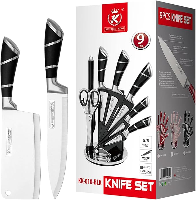 This sleek set includes every knife you need: a chef’s knife, bread knife, fruit knife, peeling knife, universal knife, sharpening rod, kitchen scissors, and a space-saving acrylic stand to keep it all beautifully displayed and organized. From meal prep to plating, this set has your back.