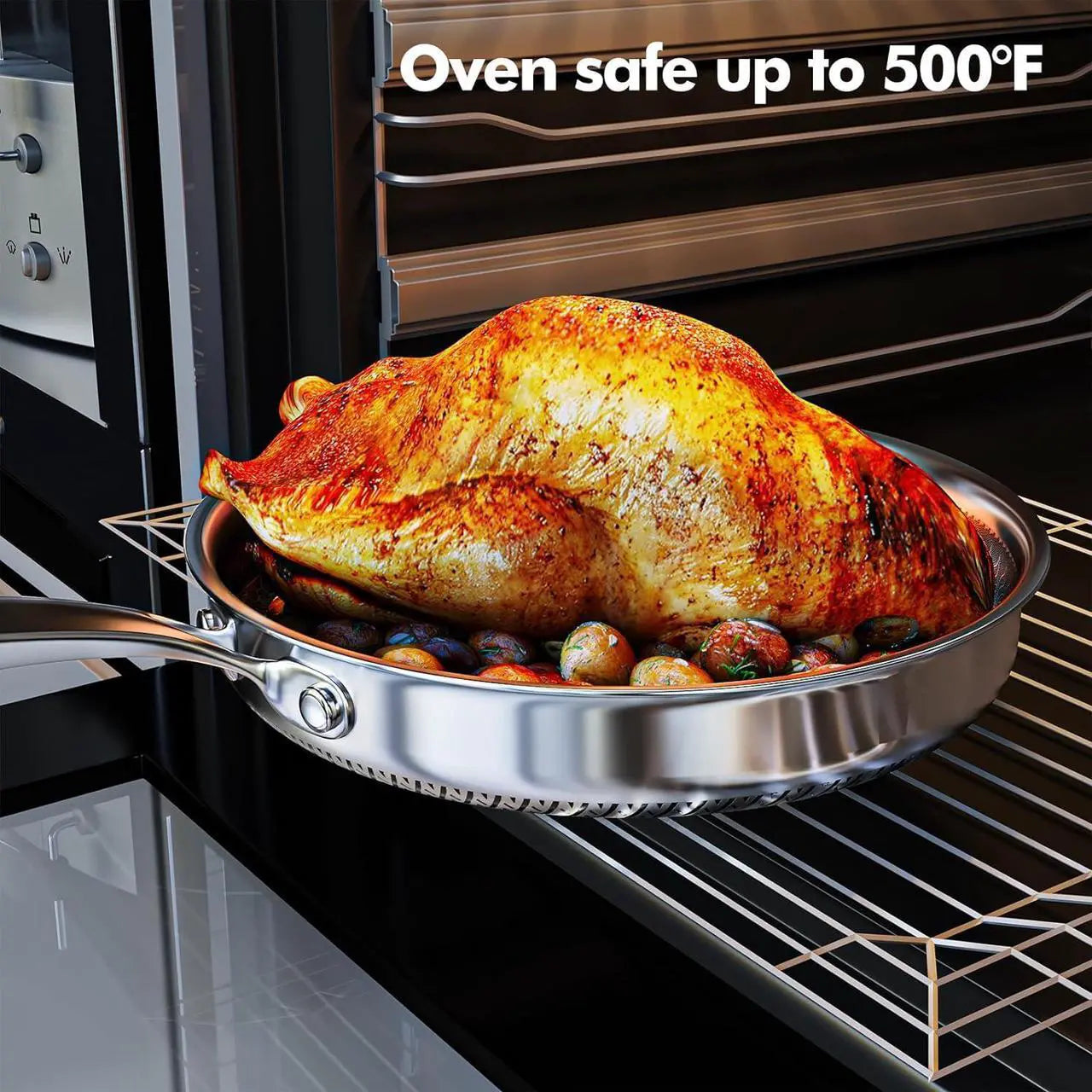 - All Hobs & Oven Safe: Tri-ply construction ensures fast, even heat distribution, compatible with induction, gas, halogen, and electric stovetops. Oven safe up to 480°F / 250°C (glass lids safe up to 210°F / 100°C).