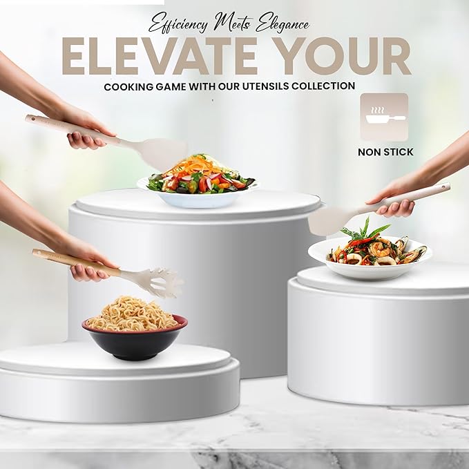 The ergonomic wooden handles not only add a touch of rustic charm but also stay cool to the touch, offering a comfortable and secure grip. These utensils are non-stick, stain-resistant, and easy to clean, ensuring they look as good as new after every use.