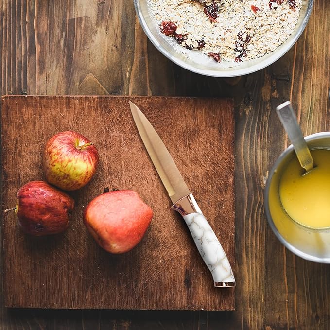 Bring some color to your kitchen! The non-stick rainbow titanium blades and elegant white marble handles add a pop of personality while staying easy to clean and maintain. Lightweight, balanced, and comfortable to grip, these knives make cutting effortless—and your kitchen more beautiful.