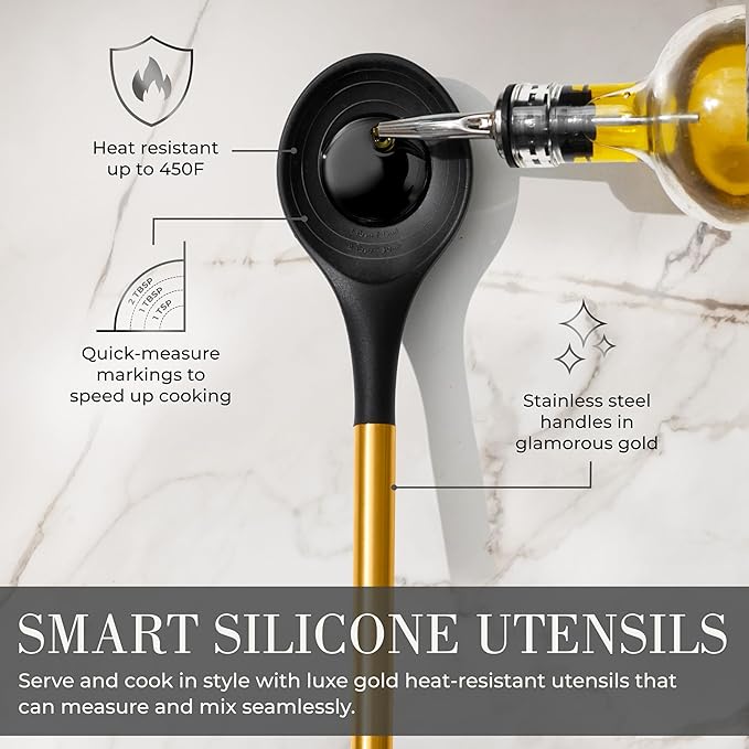 - Premium Materials: Made from food-grade, BPA-free, and heat-resistant silicone for cooking with confidence. The stainless steel utensils offer durability with a luxurious gold finish.