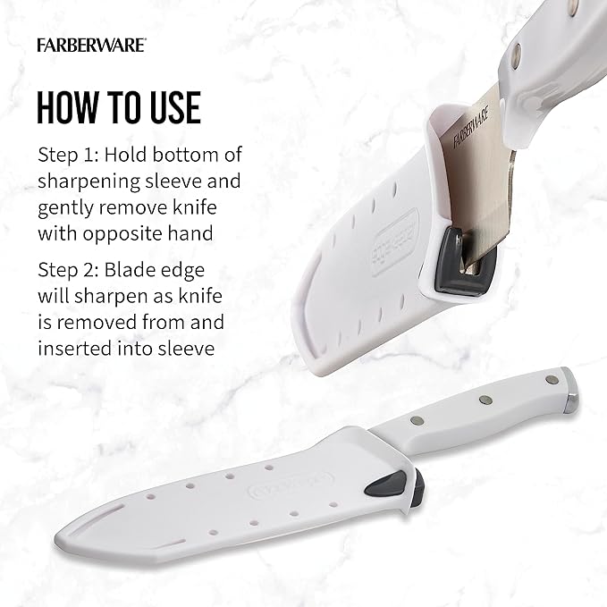 Meet your new kitchen MVP — the Farberware 8-Inch Triple-Riveted Chef Knife with a built-in self-sharpening blade cover. Sleek, smart, and ready for action, this knife takes the stress out of meal prep and keeps your edge—literally.