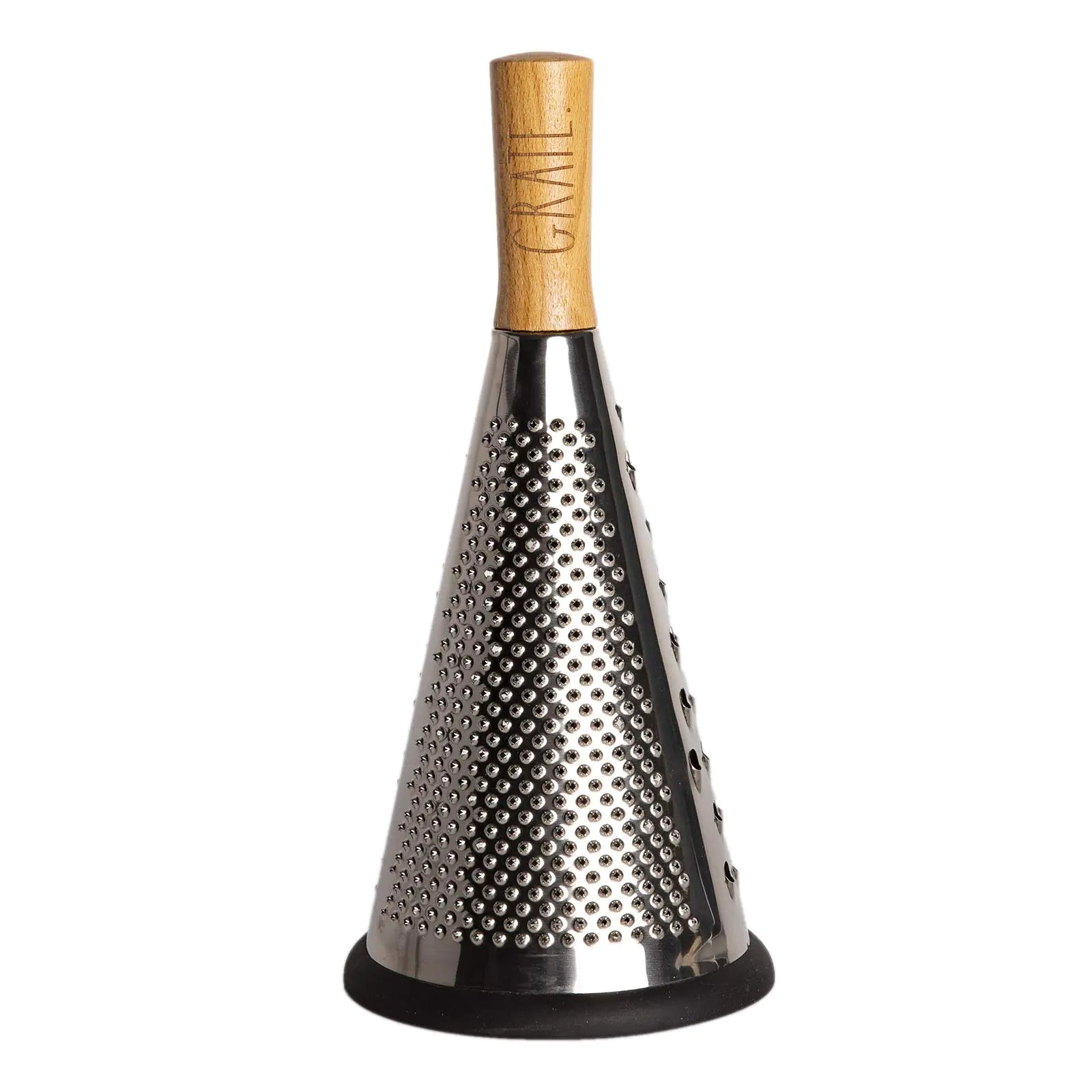 This multifunctional cone-shaped grater is designed for optimal performance and comfort. It includes a black removable silicone ring to keep it steady and secure while in use, preventing slips on your countertop. The stainless steel body ensures durability and precision, while the smooth beechwood handle provides a comfortable, natural grip that enhances your control while grating.