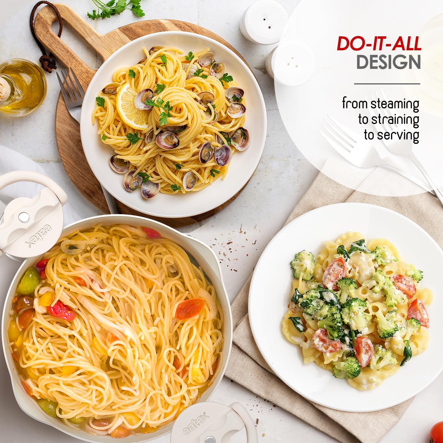 Multipurpose Cooking: More than just a pasta pot, use it to cook vegetables, ground beef, sauces, hard-boiled eggs, potatoes, popcorn, stews, soups, and more. Its versatile design combines the benefits of a colander, mixing bowl, and nonstick cookware in one.
