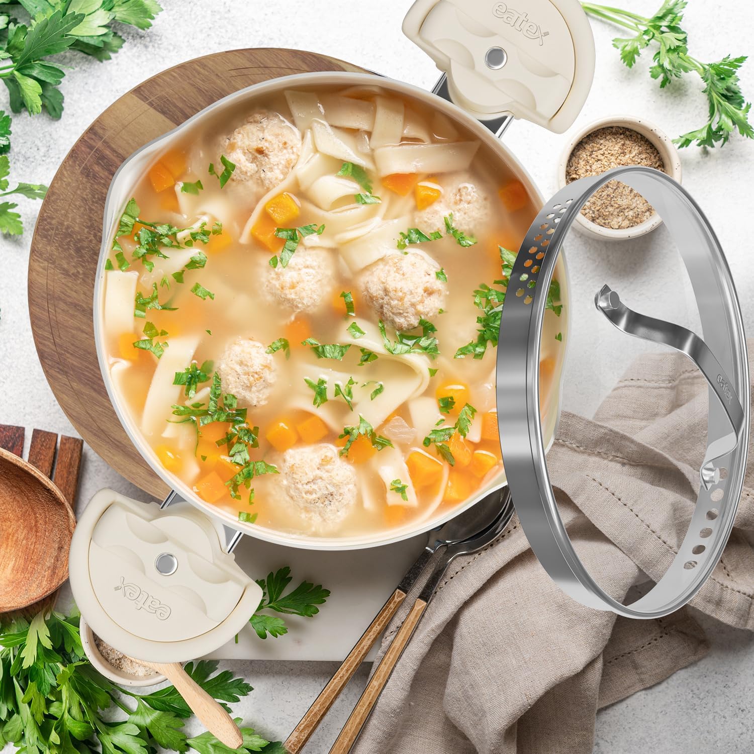 Twist & Lock Convenience: This 5-quart stock pot features innovative twist & lock handles and a tempered glass lid with dual strainers in two sizes. Effortlessly tilt and pour to strain liquids without needing a separate colander, saving space and cleanup time.